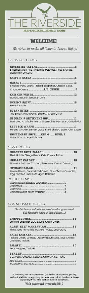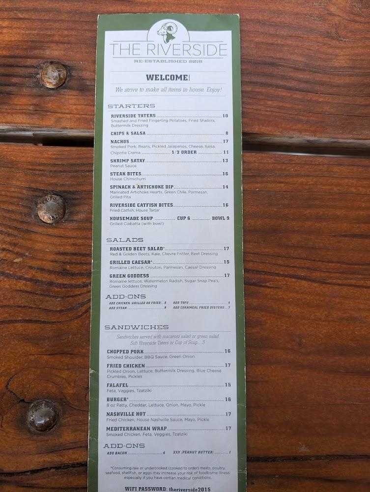 The menu at The Riverside features an assortment of comfort foods. Try their famous nachos and flavorful chicken sandwiches. The starters range from Riverside taters to shrimp satay, ensuring something for everyone. Families can count on a kids' menu filled with favorites. Vegetarian options also offer variety. Seasonal beers complement each meal perfectly, ensuring a great pairing. Desserts, like their cheesecake, make for a delightful finish after a hearty meal.